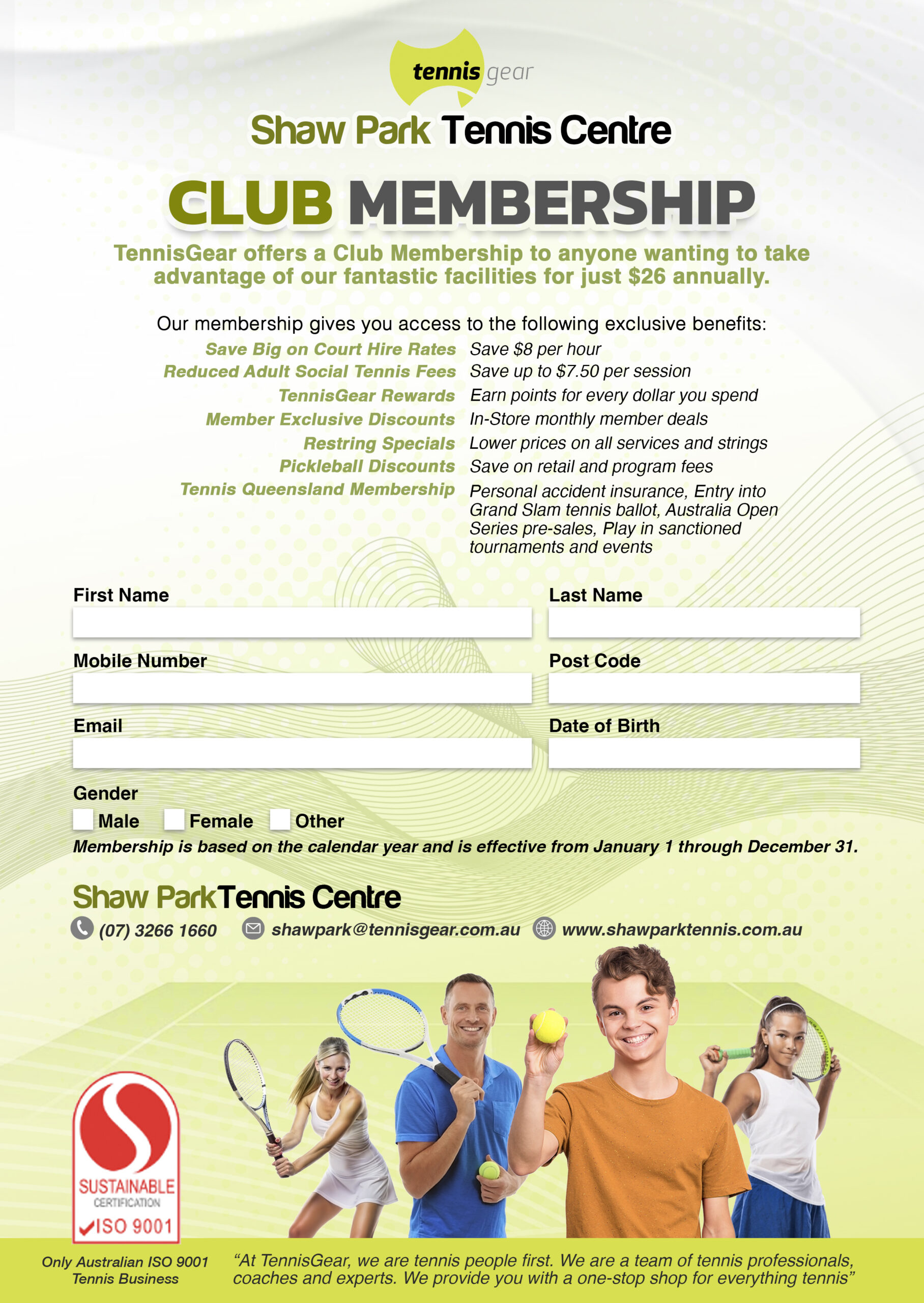 Not only that, included in that $26 is – membership to the 5 other TennisGear centers we have in Brisbane. The membership gives you discounts on court hire, social tennis as well as some additional benefits, Tennis Queensland membership which includes Personal Accident Insurance.